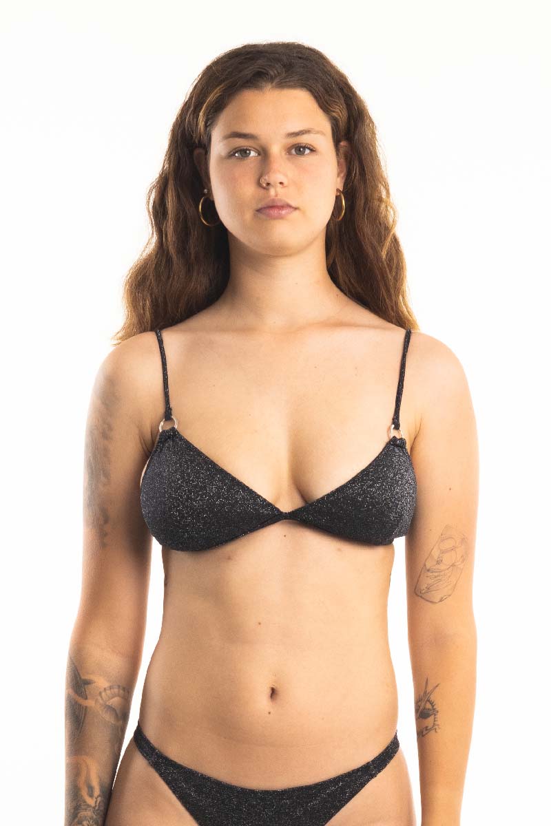 Si te gustan los triángulos, este lo vas a amar. Viene con una fina capa de relleno, con breteles regulables, argolla en bretel y broche en espalda. Confeccionada en tela brilli brilli.